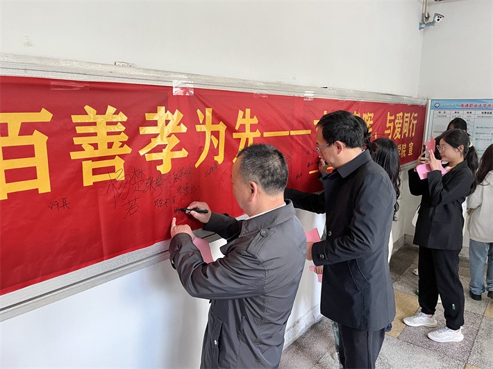 随后,员工代表赵伊洁带领全体同学诵读《弟子规 入则孝》,同学们铿锵有力的声音在校园内回响,让大家明白孝道经过千年历史发展已然成为流淌在我们血液中的传统美德。最后,师生代表在横幅上签名,以此见证校园孝文化的传承,见证同学们践行孝文化的行动。